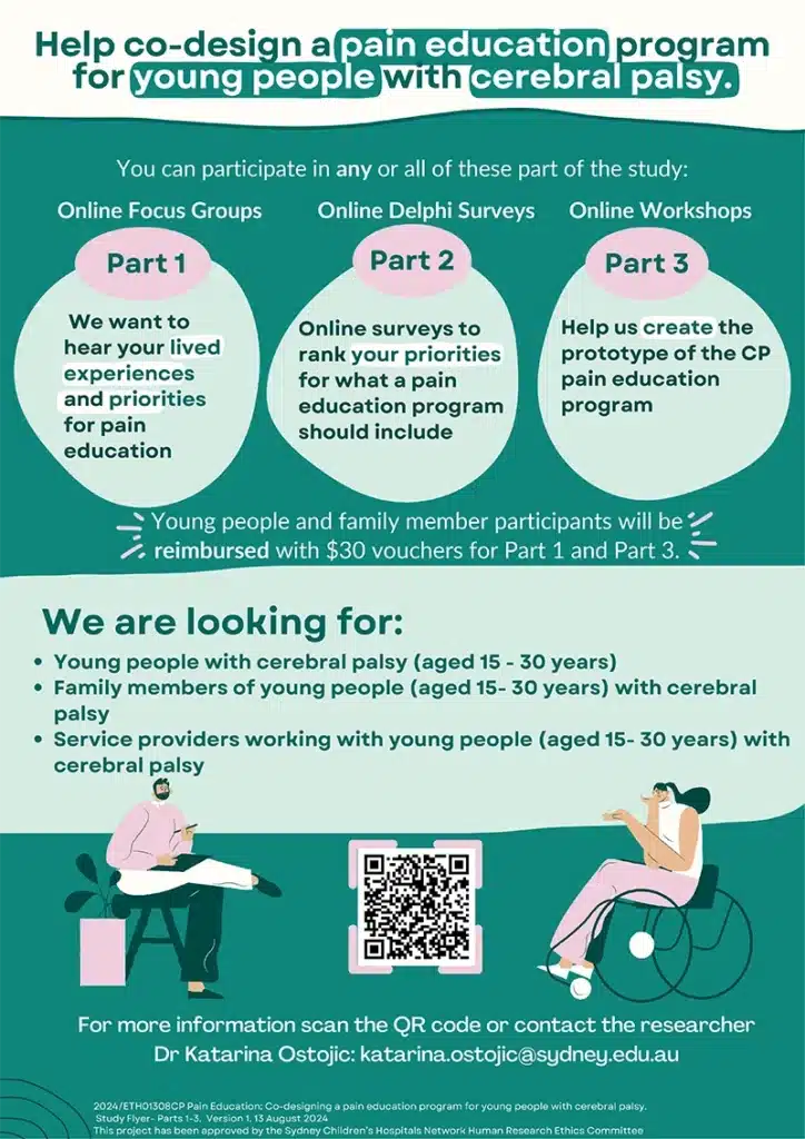 In this project, researchers will work in partnership with young people with CP (aged 15-30 years), family members of young people with CP, and service providers to co-design a CP-specific pain education program. The program will provide information and resources to help a person manage their pain. We aim to work together to create a program that meets people’s needs and preferences.
