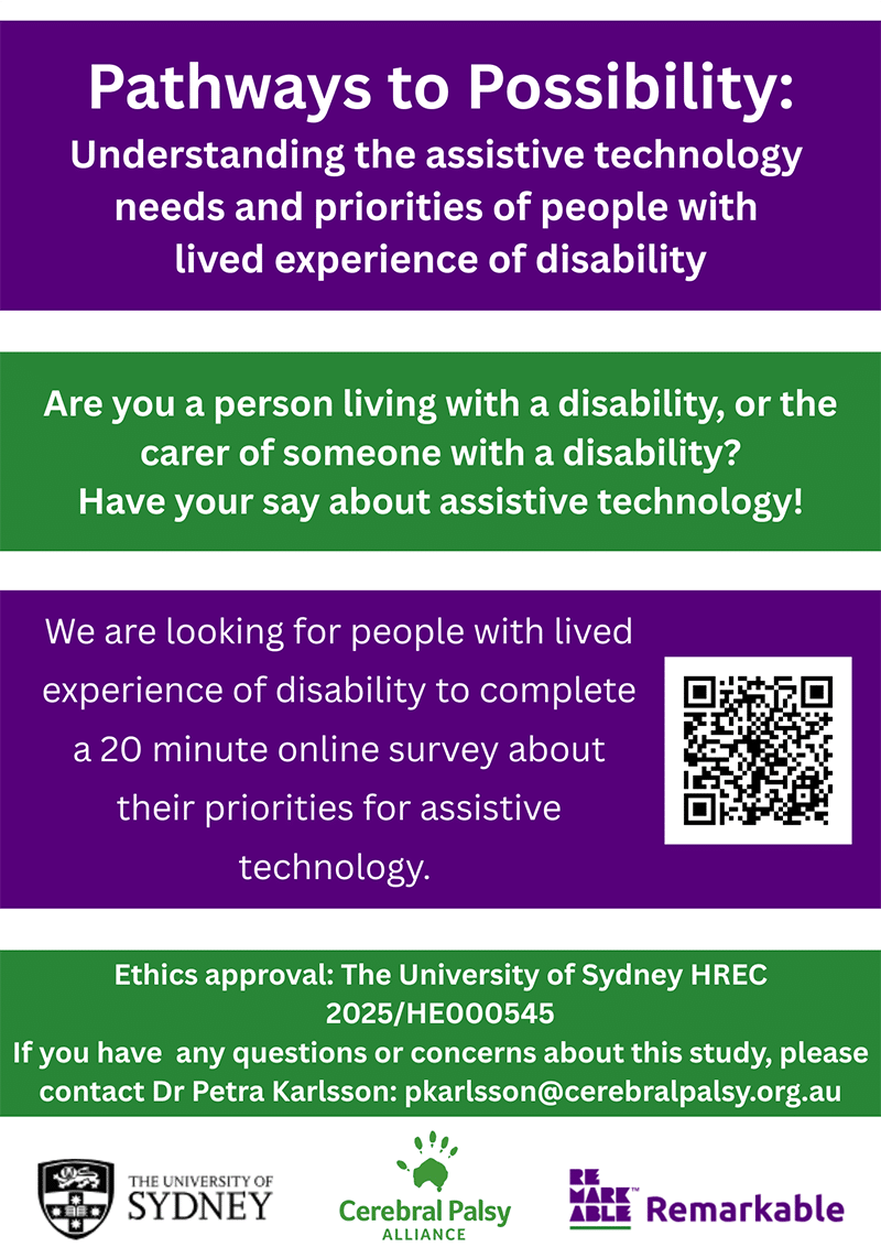 This research study aims to understand the needs and priorities of people with lived experience of disability. This will guide the research and development of new assistive technologies (AT) undertaken by CPA Research Institute, and supported through Remarkable programs, so that future technology can better support people with disability.